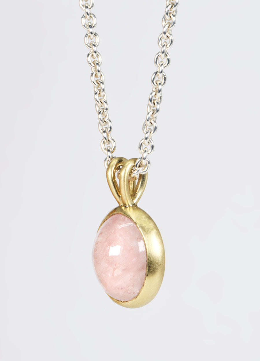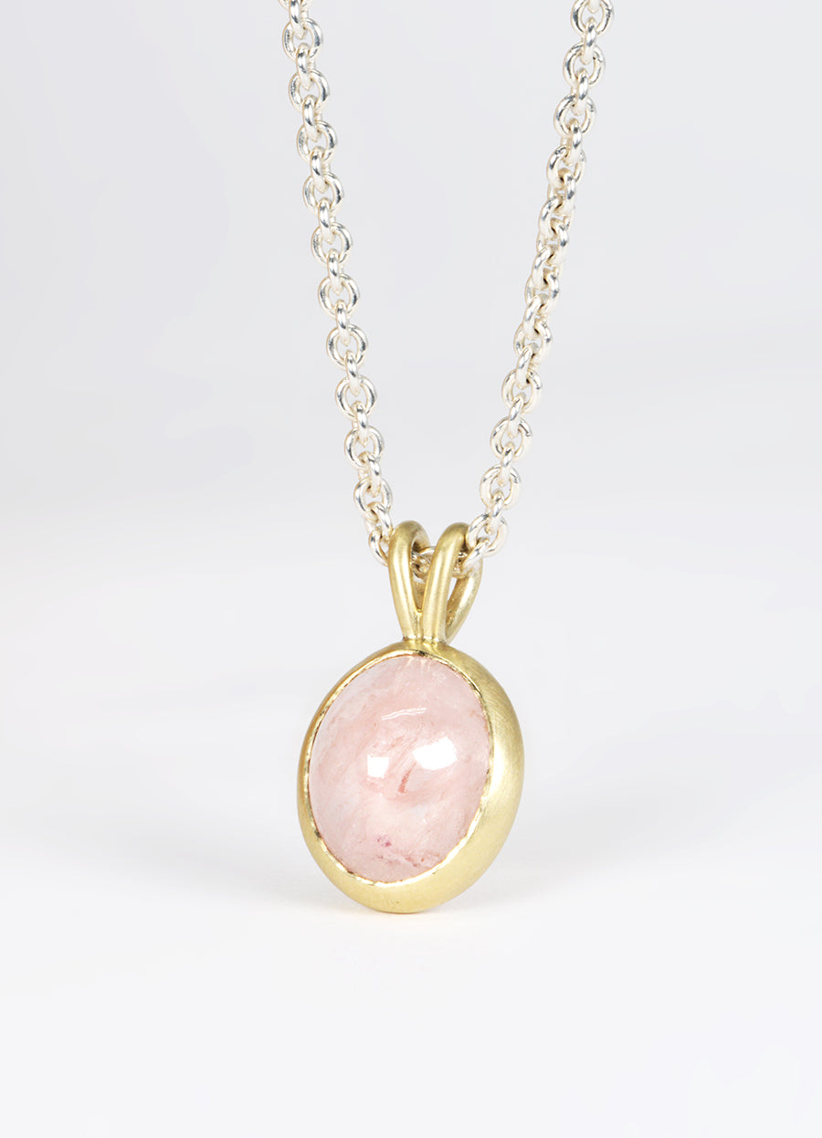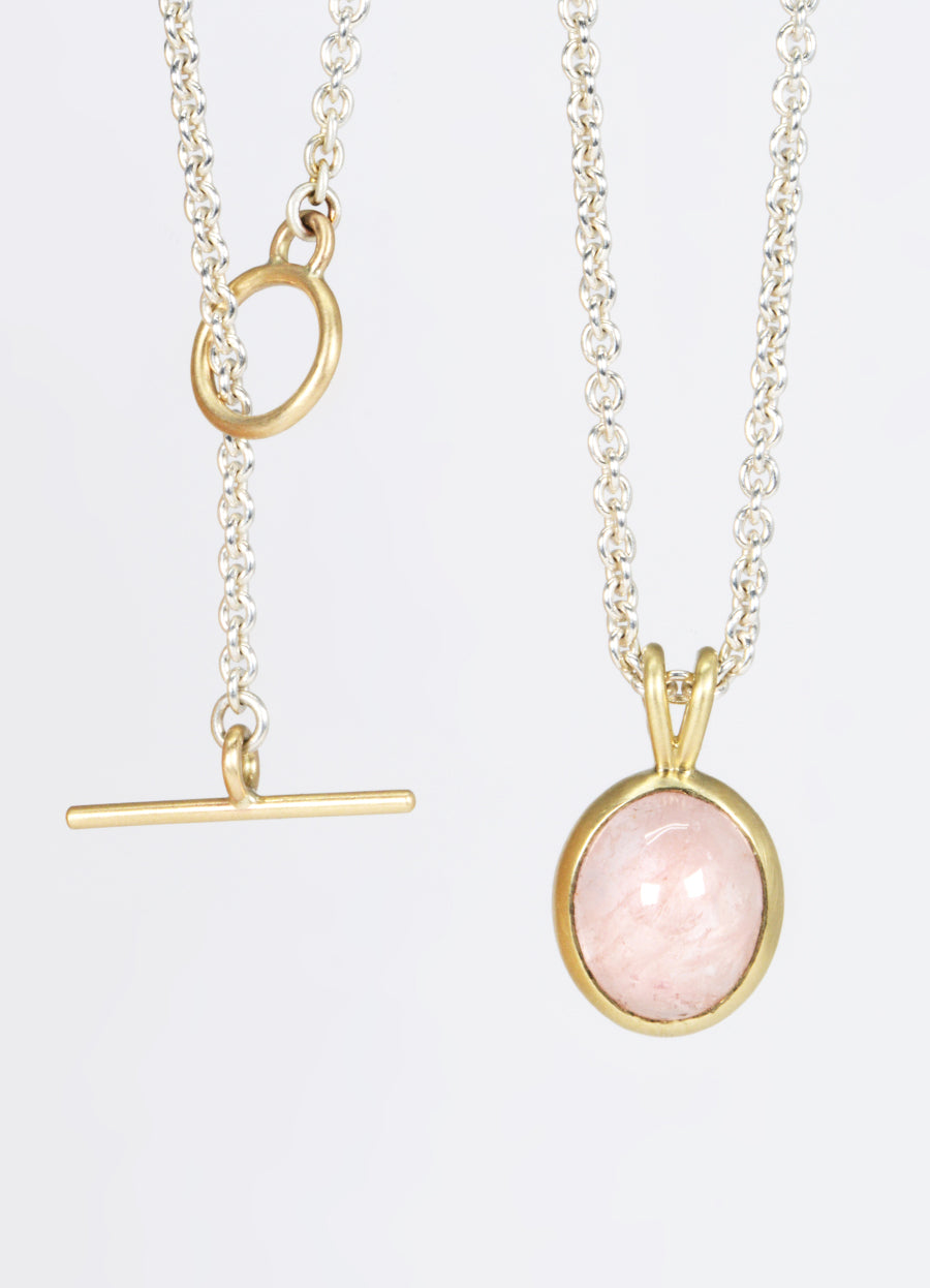 A softly glowing 5.5ct pink cabochon Morganite, forms the centrepiece of this hand crafted necklace. Featuring a 9ct yellow gold bezel suspended from a heavyweight silver trace chain (18.5"), the necklace features a hand crafted T-bar fastener adding a tactile, and distinctive detail that emphases both the craftsmanship and elegance of the piece.