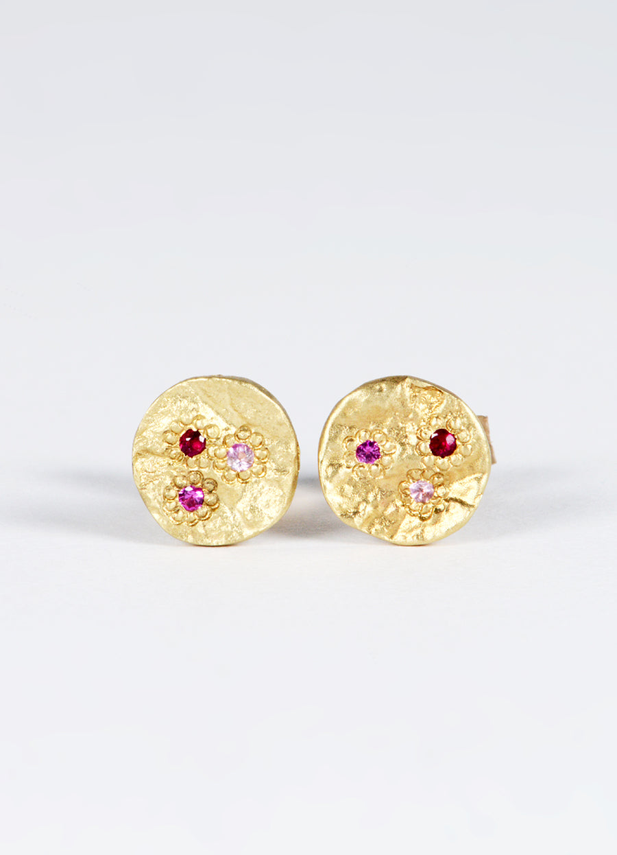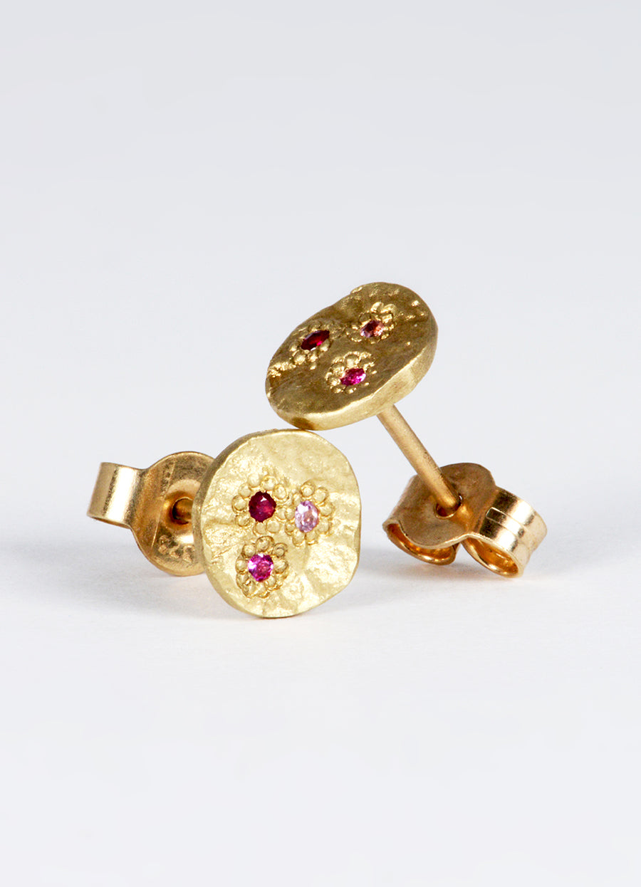 Our daintiest round Flux studs in solid 9ct Yellow Gold and set with a mix of soft, subtle and vivid Pink Sapphires intricately nestled amidst the surface of textured metal, characteristic of our Flux collection.