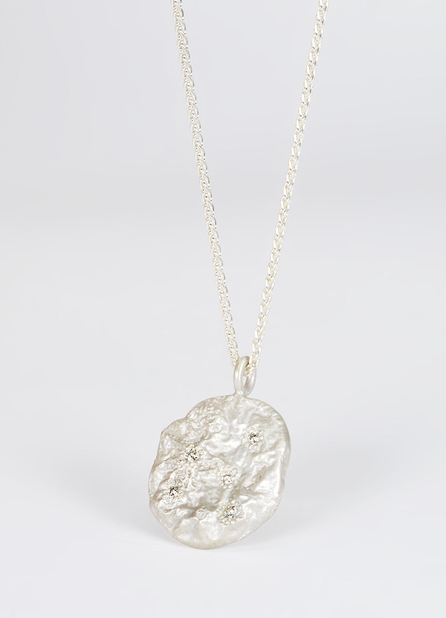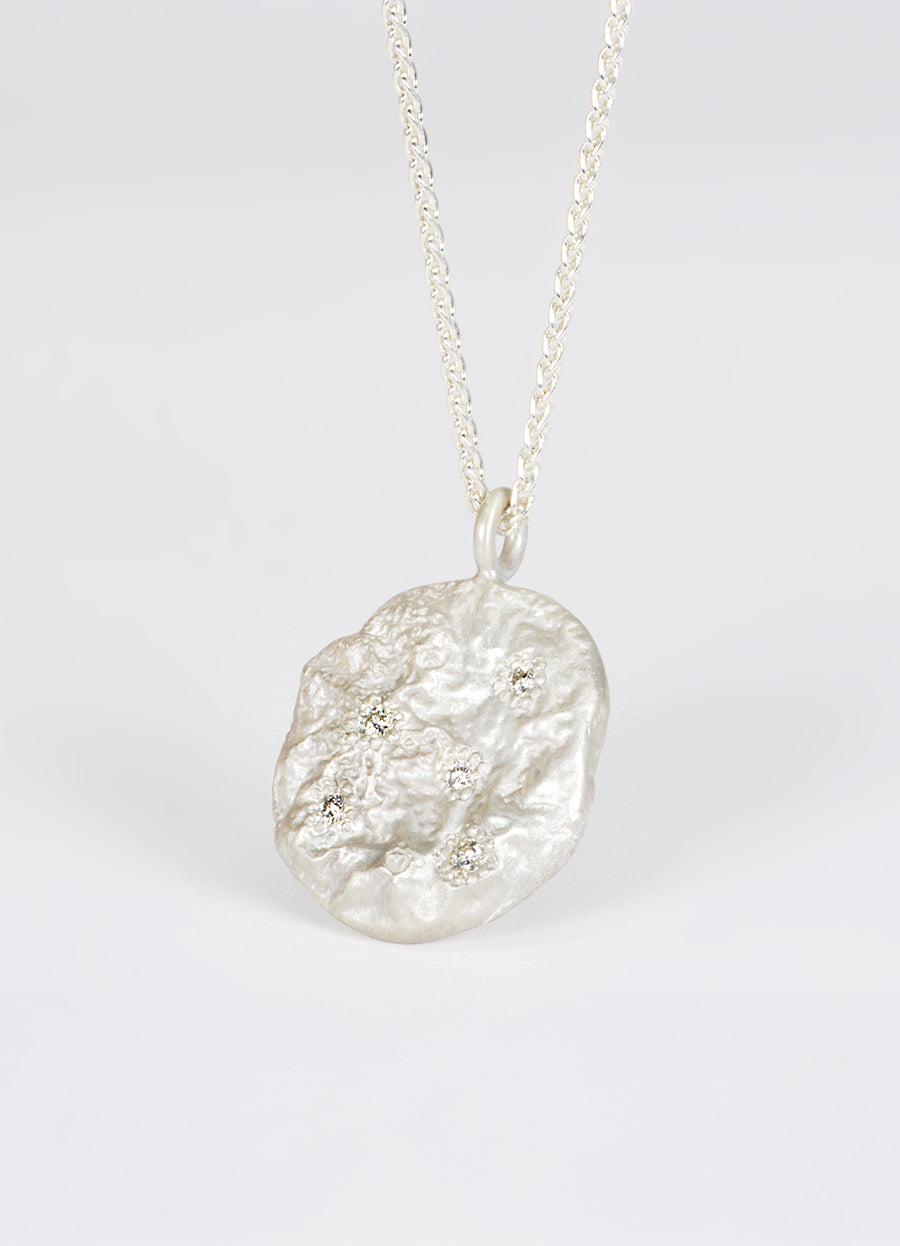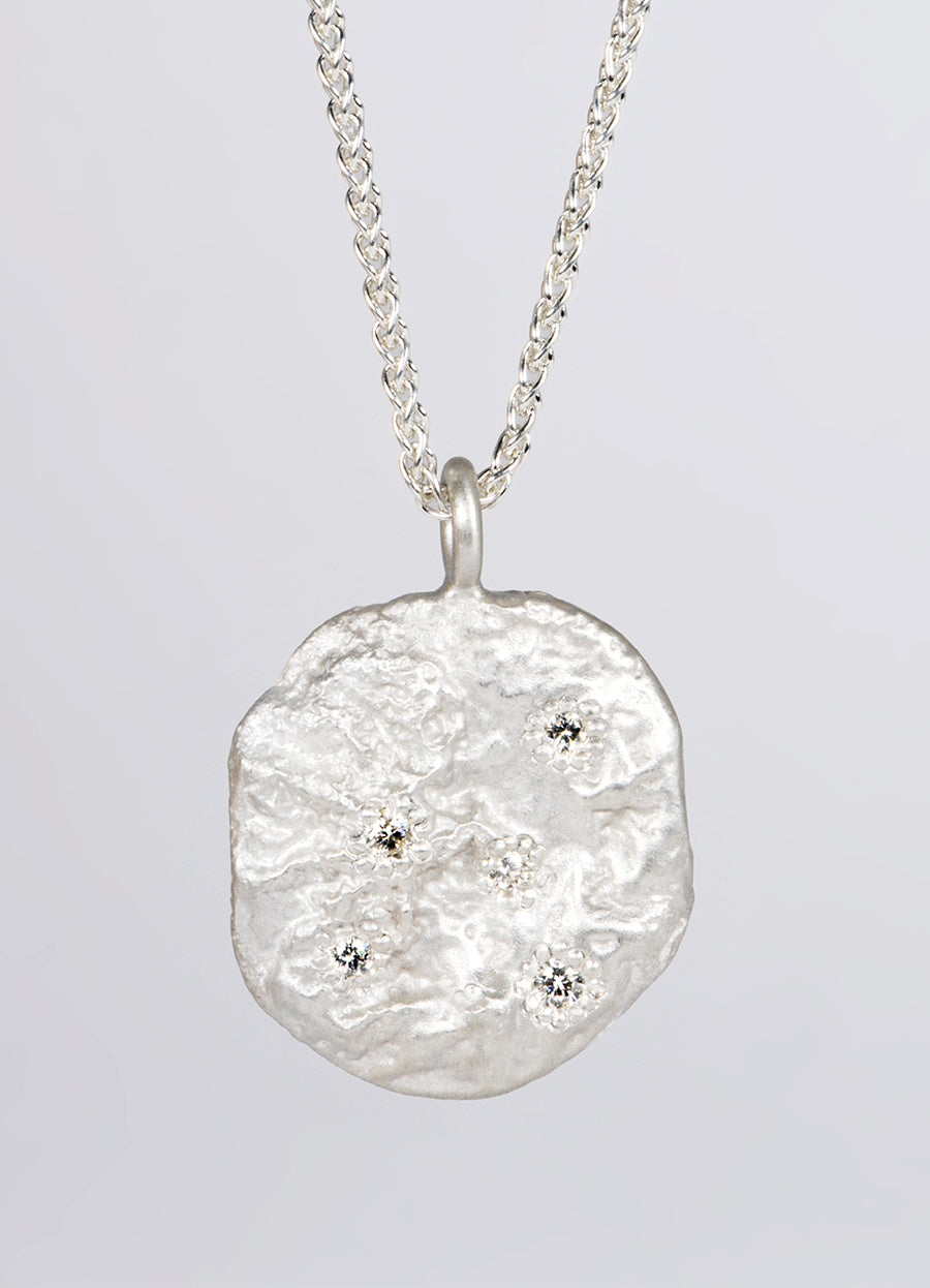 A solid silver round pendant encrusted with five bright white brilliant cut Lab Grown Diamonds. The tactile surface has a matt finish that will become more lustrous in the raised areas over time. Reassuringly weighty but ideal for everyday wear, as well as easily elevated to occasion wear.