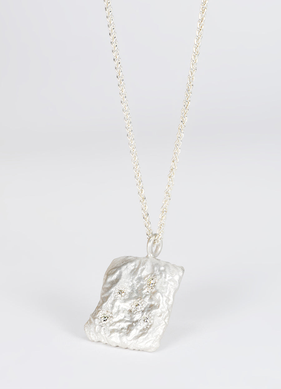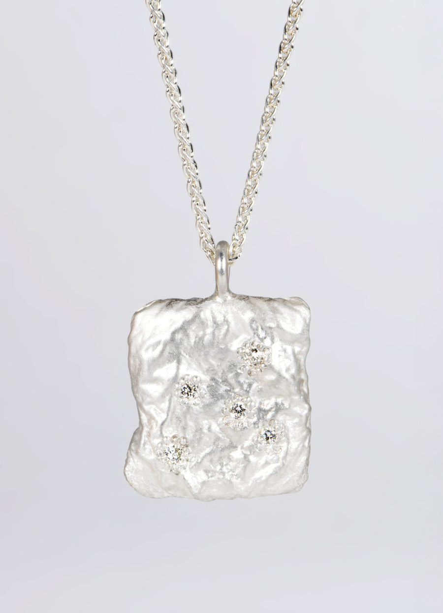 A solid silver square pendant encrusted with five bright white brilliant cut Lab Grown Diamonds. The tactile surface has a matt finish that will become more lustrous in the raised areas over time. Reassuringly weighty but ideal for everyday wear, as well as easily elevated to occasion wear.
