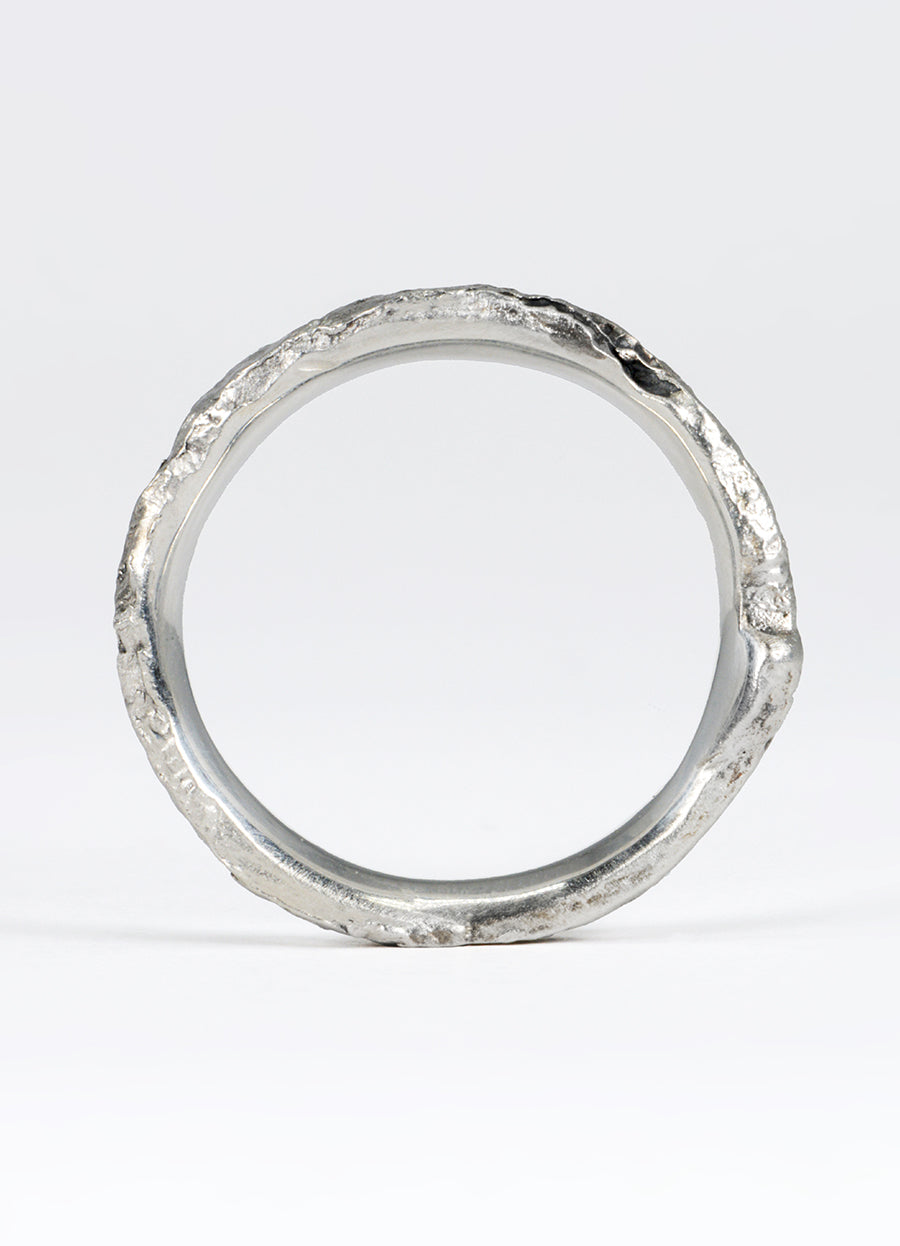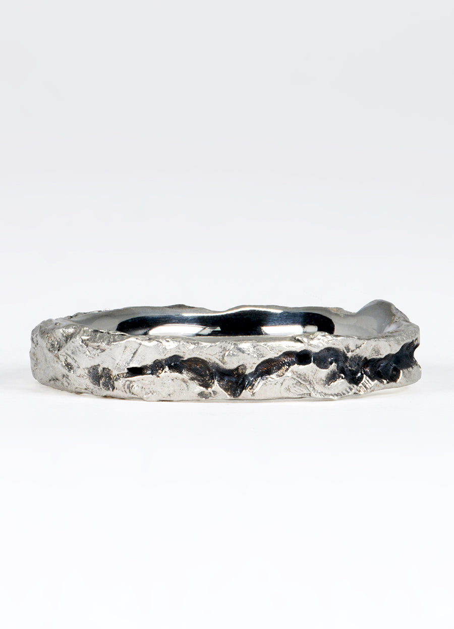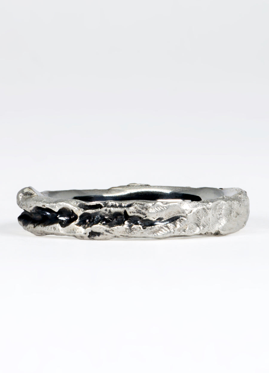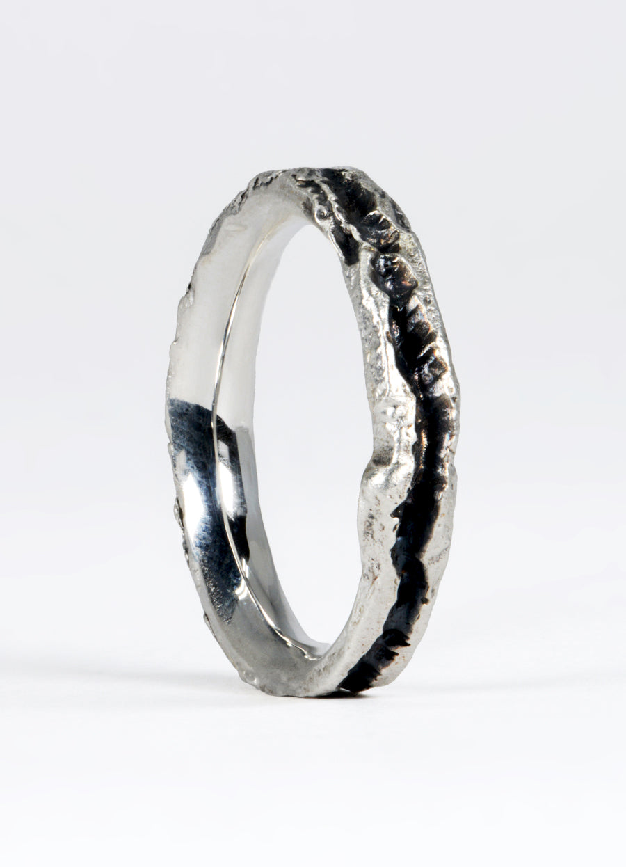 Our 4mm silver Flux ring with a carved canyon of oxidised silver, cutting through the molten-like appearance, creating a striking contrast. A great piece to wear everyday, with a raw, textured outer reminiscent of age-old stone and highly polished inner band for comfort, these Flux rings epitomise the beauty and permanence of nature.
