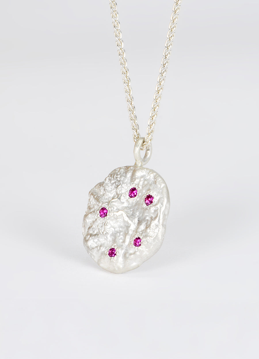 A solid silver round pendant encrusted with five wonderfully lively, vivid Pink Sapphires. The tactile surface has a matt finish that will become more lustrous in the raised areas over time. Reassuringly weighty but ideal for everyday wear, as well as easily elevated to occasion wear.