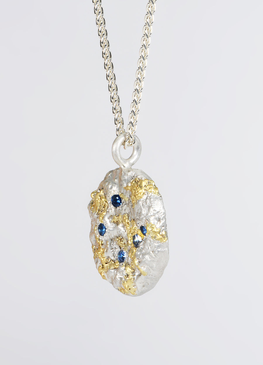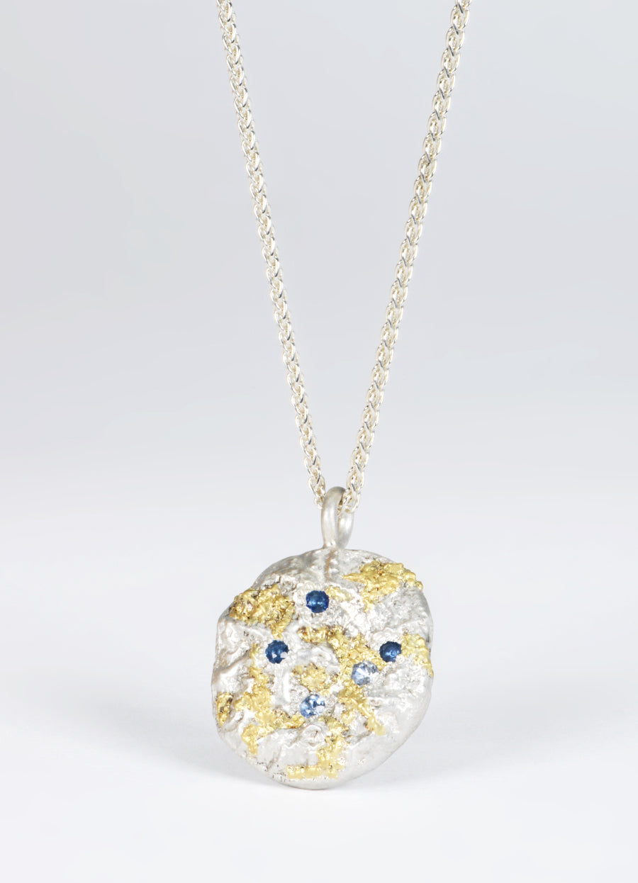 A solid silver round pendant encrusted with five luminous blue Sapphires, each varied in tone, and a touch of splashed molten 18ct yellow gold. The tactile surface has a matt finish that will become more lustrous in the raised areas over time. Reassuringly weighty but ideal for everyday wear, as well as easily elevated to occasion wear.