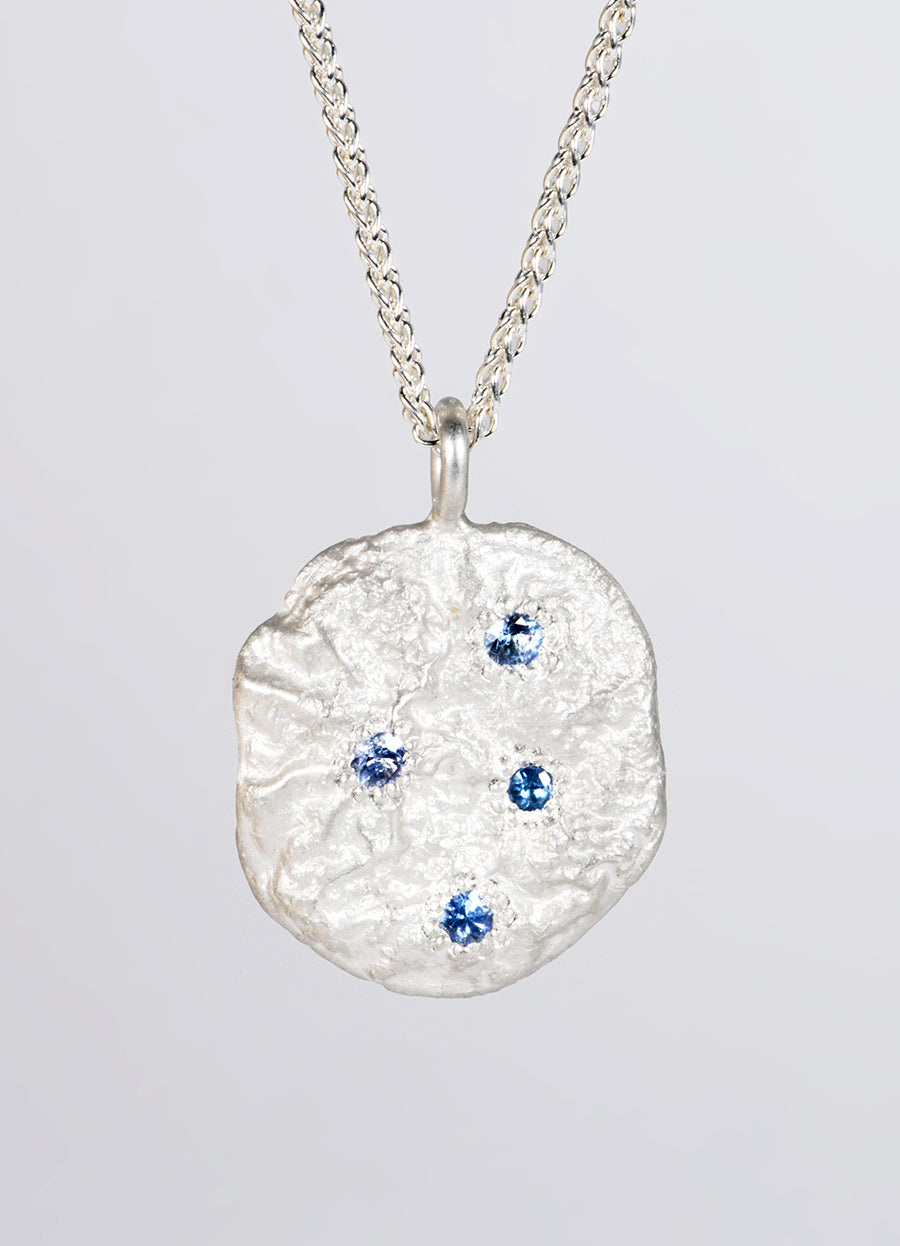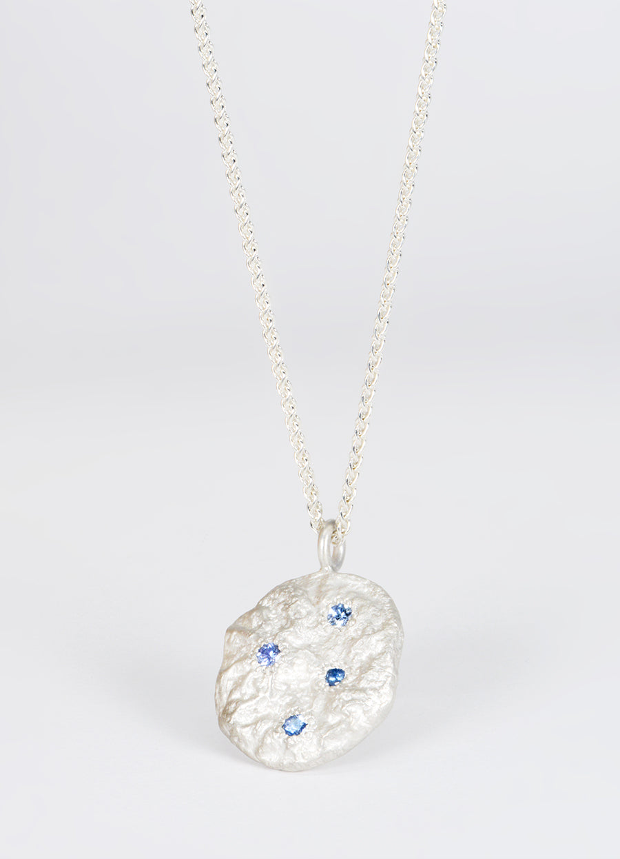 A solid silver round pendant encrusted with four luminous blue Sapphires, each varied in tone. The tactile surface has a matt finish that will become more lustrous in the raised areas over time. Reassuringly weighty but ideal for everyday wear, as well as easily elevated to occasion wear.