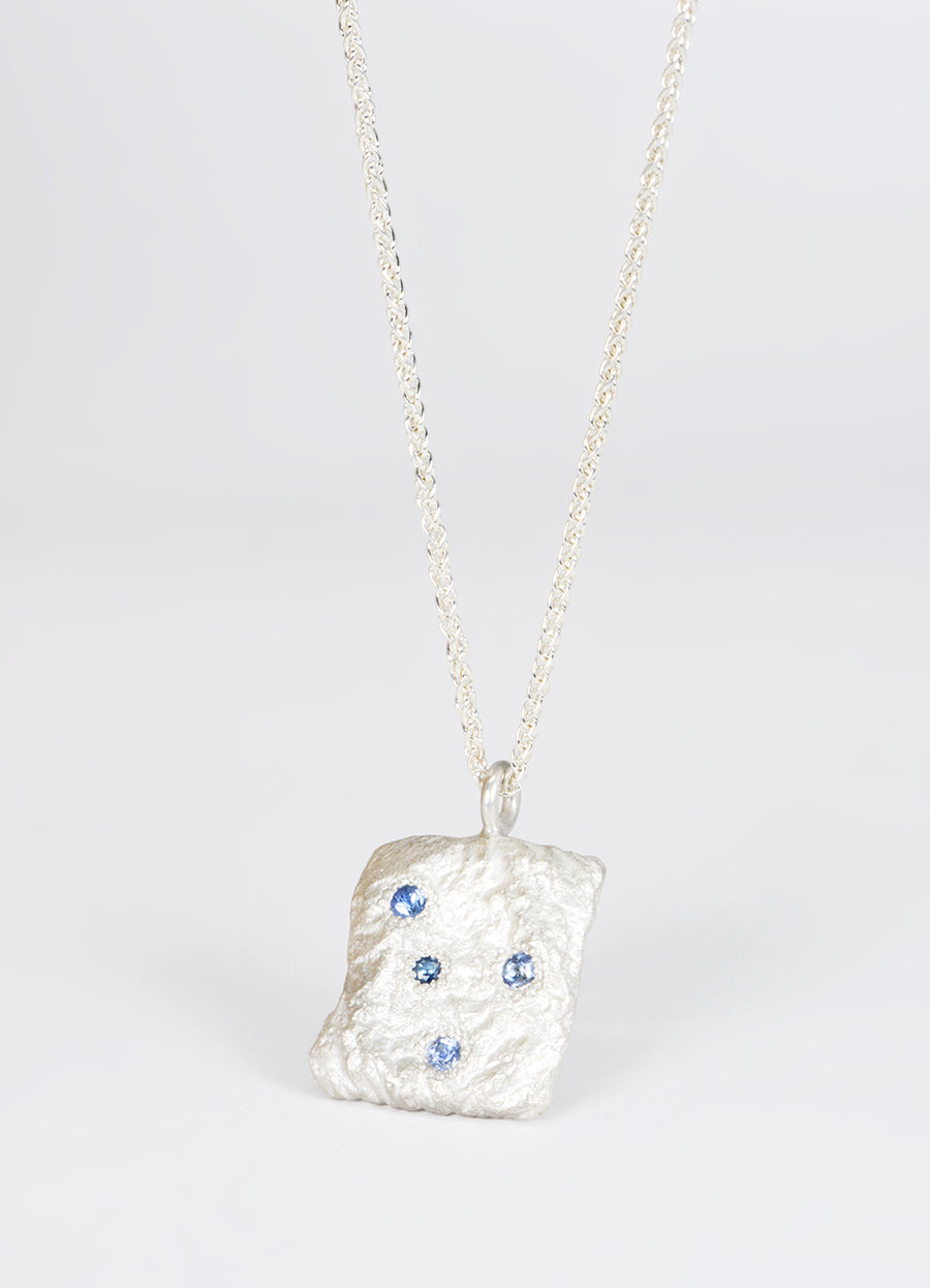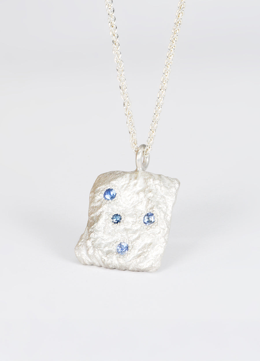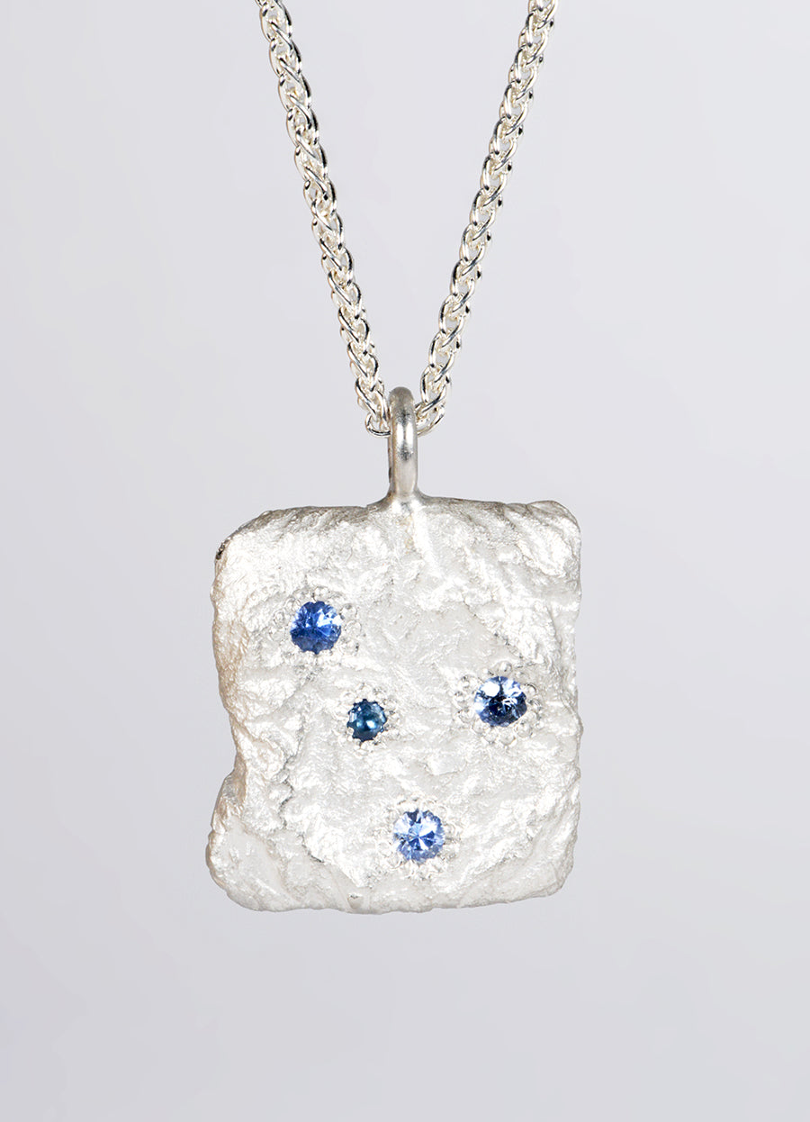 A solid silver square pendant encrusted with four luminous blue Sapphires, each varied in tone. The tactile surface has a matt finish that will become more lustrous in the raised areas over time. Reassuringly weighty but ideal for everyday wear, as well as easily elevated to occasion wear.