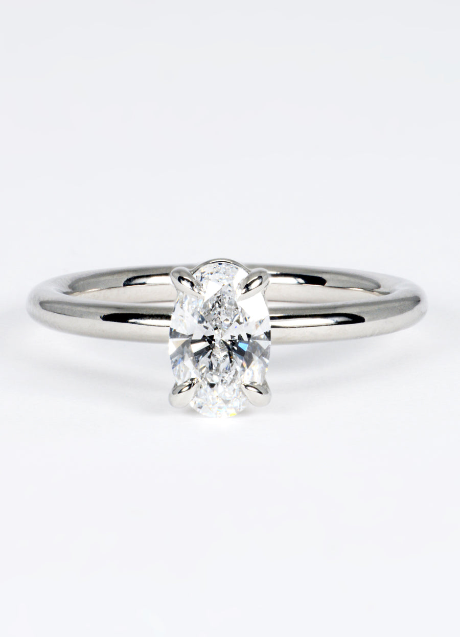 The intense sparkle of this elegant oval diamond is perfectly balanced by the crisp white sheen of the polished platinum band. Delicate talon settings hold the stone securely, allowing light to flow through every facet and creating clean lines with no visible edge.