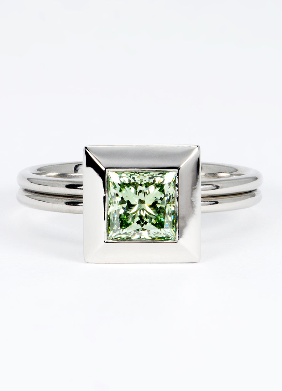 Evoking nature and the elements, this rare-hued 1.06ct Fancy Vivid Green Princess-cut diamond sits at the heart of a handcrafted platinum ring. Perfectly balanced amidst the minimal setting, the crisp, clean lines of a double row polished platinum band enhance the stone’s extraordinary colour and brilliance. The open backed setting allows light to flood to the stone, helping give that extra sparkle to a truly breathtaking diamond.